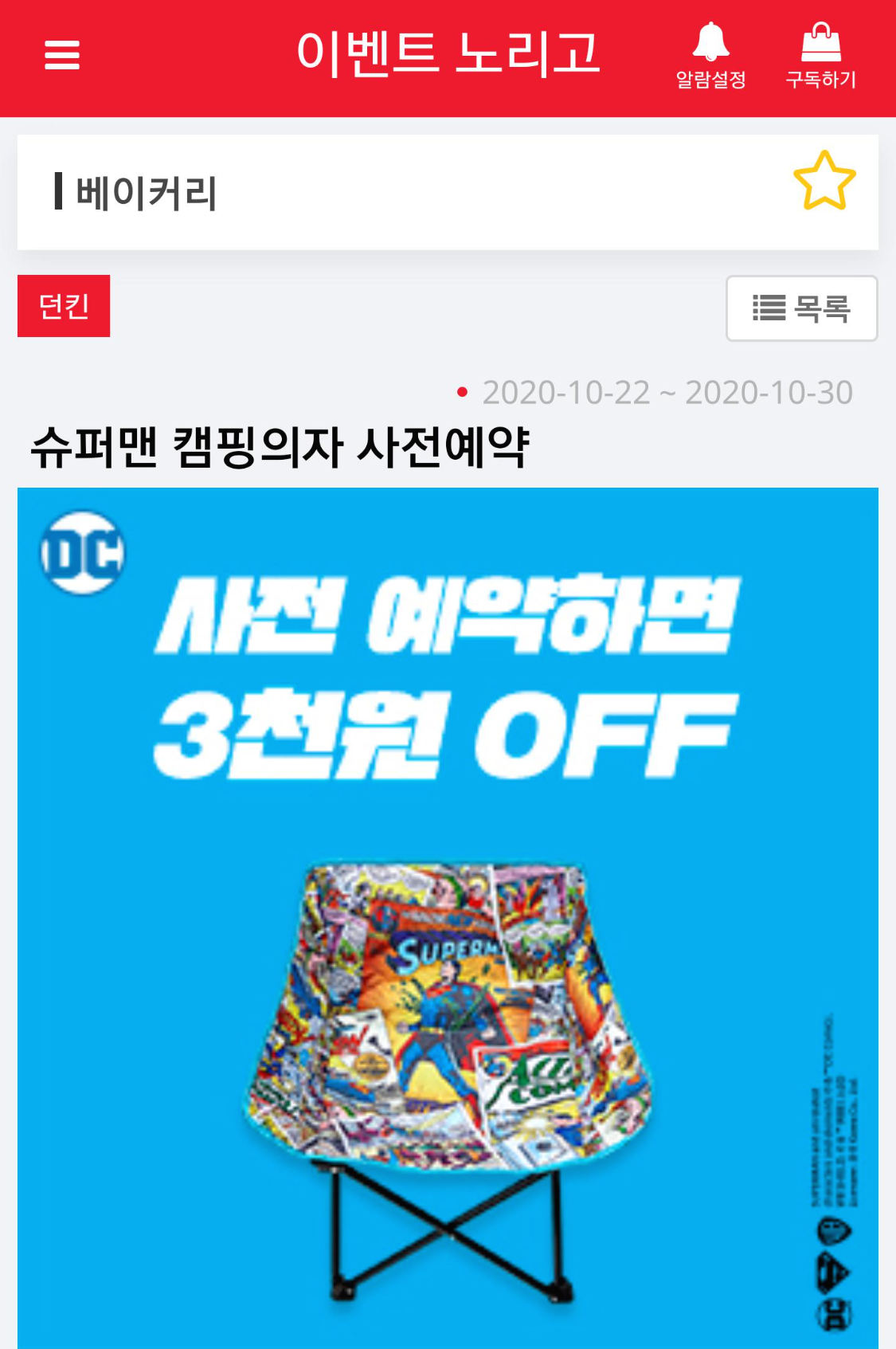 | 오늘의 이벤트 - [던킨]슈퍼맨 캠핑의자 사전예약 (0) | 2020.10.23 |