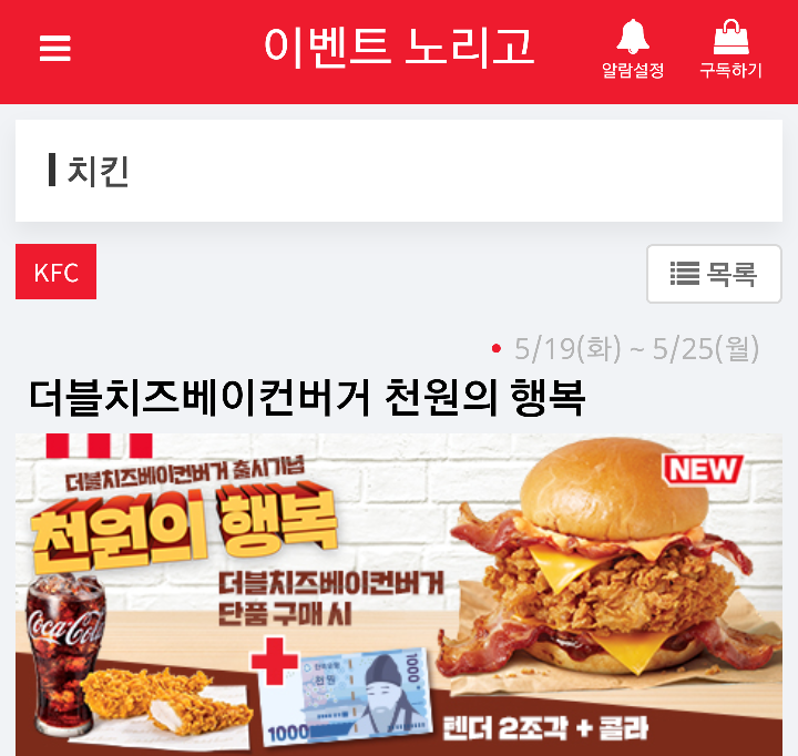 | 오늘의 이벤트 - KFC 더블 치즈 베이컨 버거 출시 기념 (0) | 2020.05.19 |